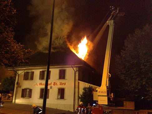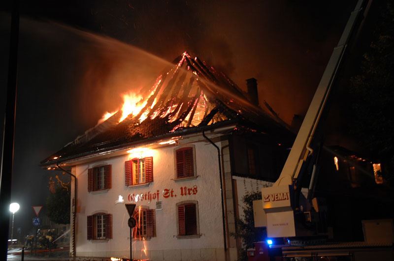 Heute, Samstagnacht, kurz nach 2 Uhr meldete ein Augenzeuge, dass das Dach des Restaurant St. Urs brennt. Umgehend wurde die Feuerwehr Biberist aufgeboten, welche innerhalb weniger Minuten vor Ort war. Das Gebäude war bereits in Vollbrand. Sofort wurde Verstärkung angefordert. Es wurden in der Folge die Feuerwehren Derendingen, Zuchwil, Lohn-Ammannsegg, Gerlafingen und die M-real von Biberist aufgeboten. Es standen ca. 150 Feuerwehrleute im Einsatz, welche dank ihrer raschen Handlungen ein übergreifen des Feuers auf die anliegenden Gebäude verhindern konnten.