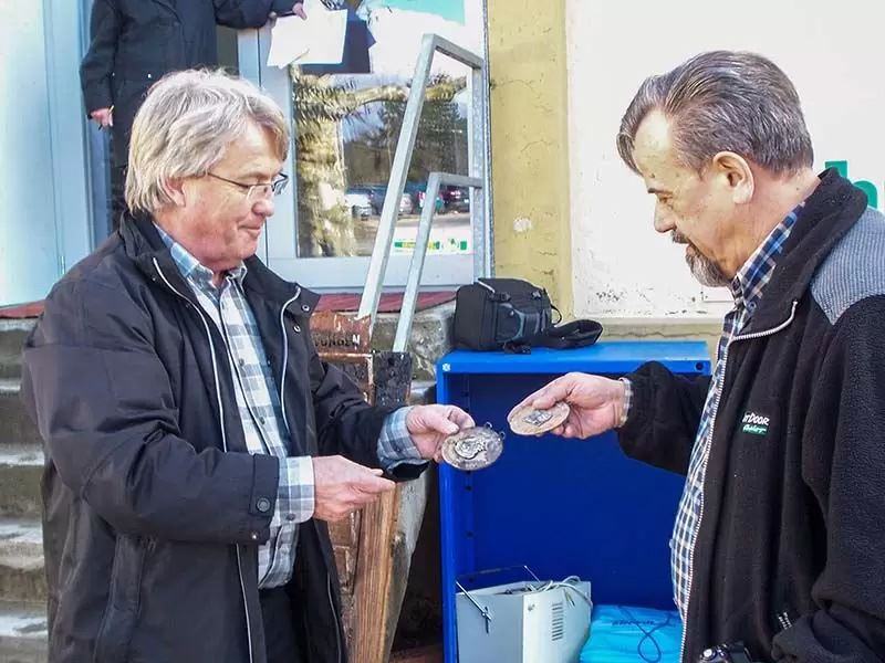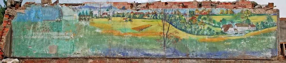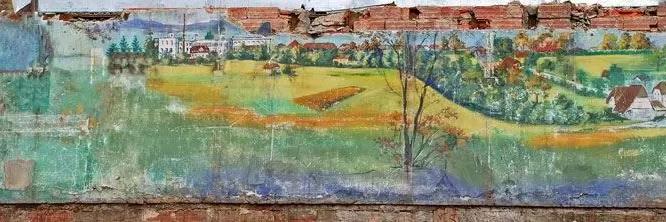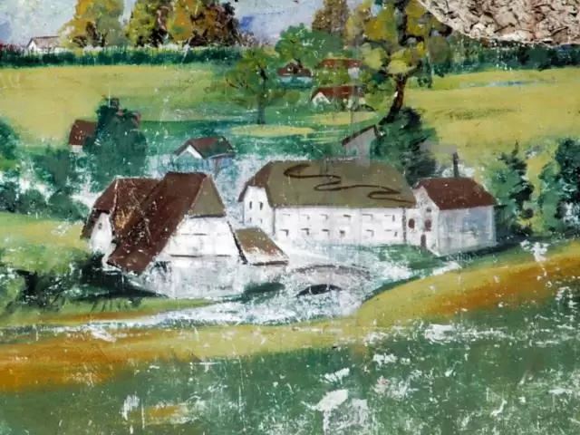Beim Rückbau der Saal-Bühne kam obenstehendes Gemälde zum Vorschein. Es wurde bei einer früheren Renovierung des Saales mit feuerfesten Platten überdeckt.